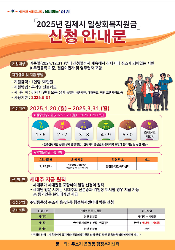 - 지급대상: 주민등록 기준 김제시민 및 영주권자