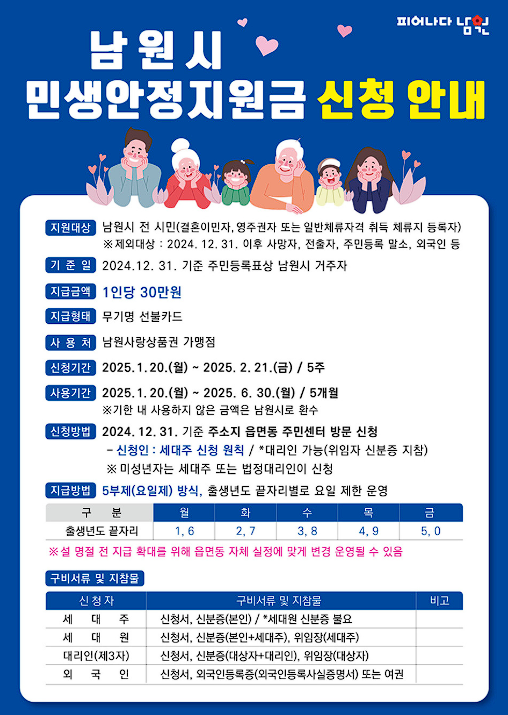 - 지급방식: 남원사랑상품권(선불카드)으로 지급.