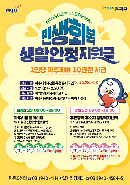 - 지원대상: 2024년 12월 26일 기준 파주시에 주민등록을 둔 내국인